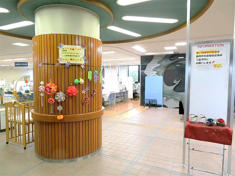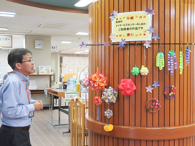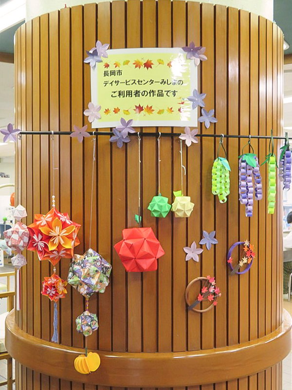 デイサービスのご利用者が製作される作品を、外部の方にも見ていただける機会があると良いのですが・・・という要望を快諾いただき、長岡市デイサービスセンターみしまのご利用者作品を、三島支所に展示させていただくことになりました。