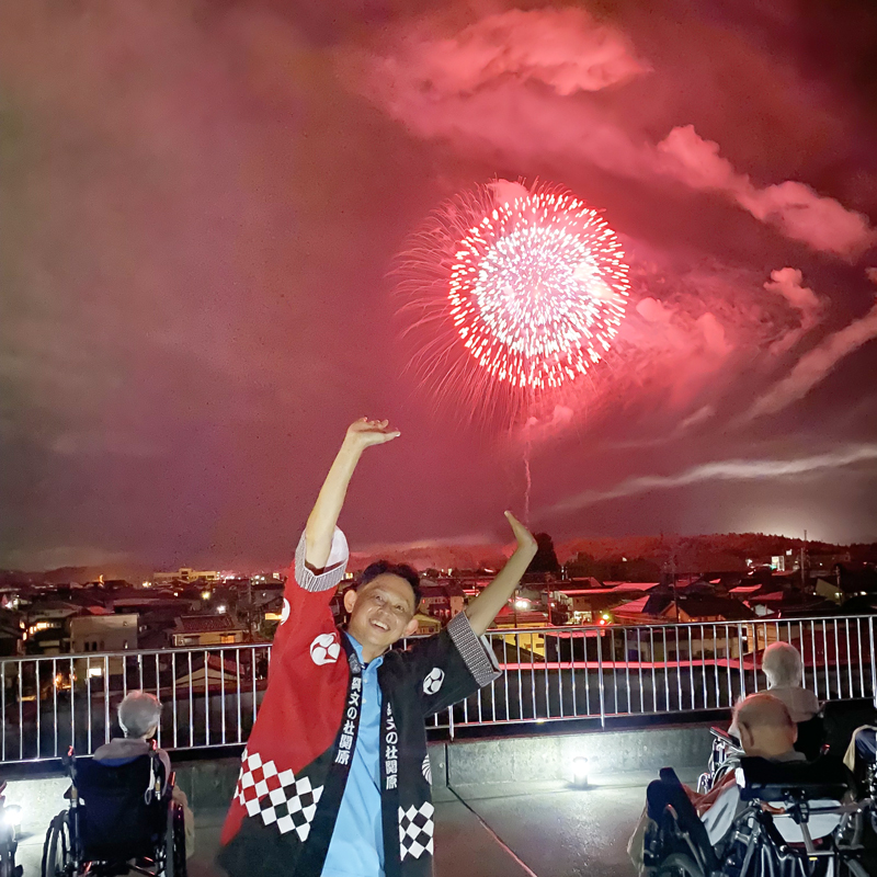 翌14日には、ご利用者と一緒に夜空を彩る花火を観賞しました。職員もご利用者と同じように「きれいだね!」と声を上げ、笑顔と歓声が絶えないひとときとなりました。