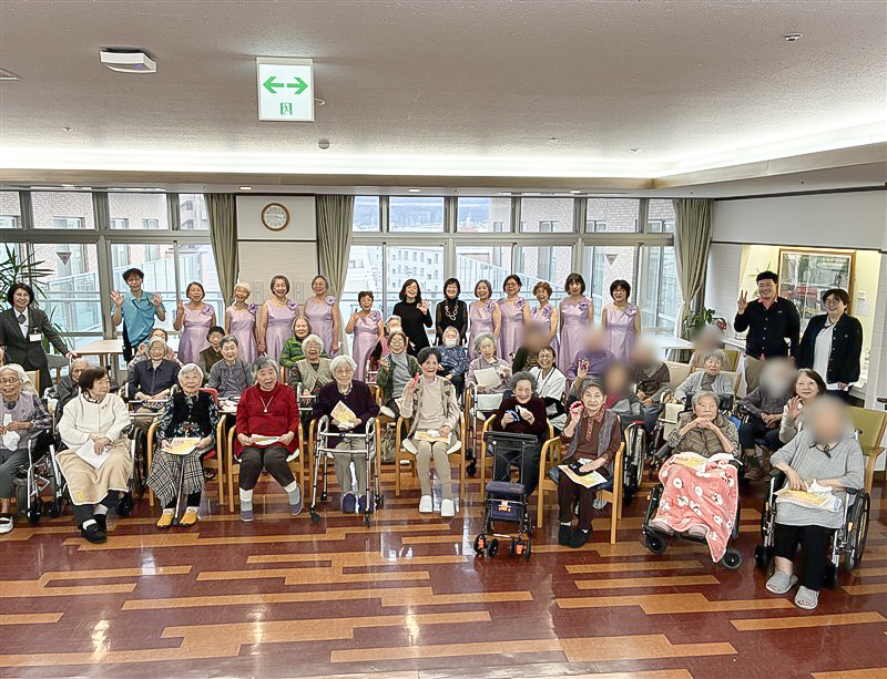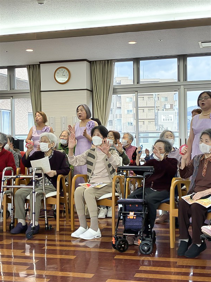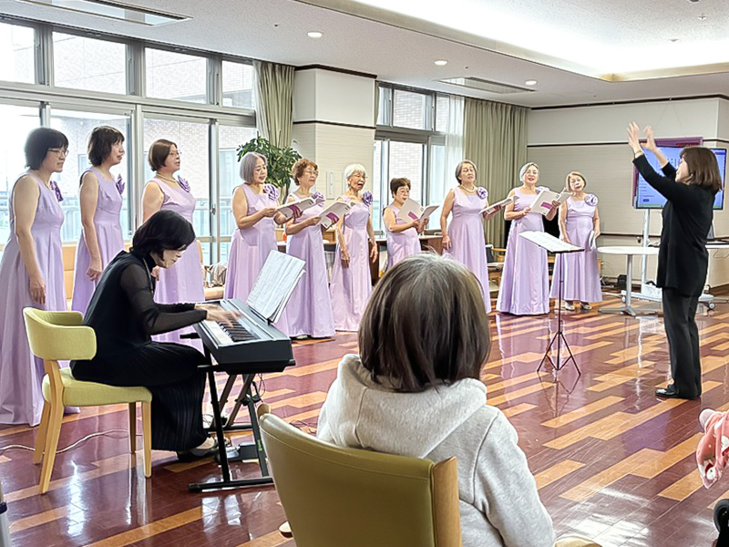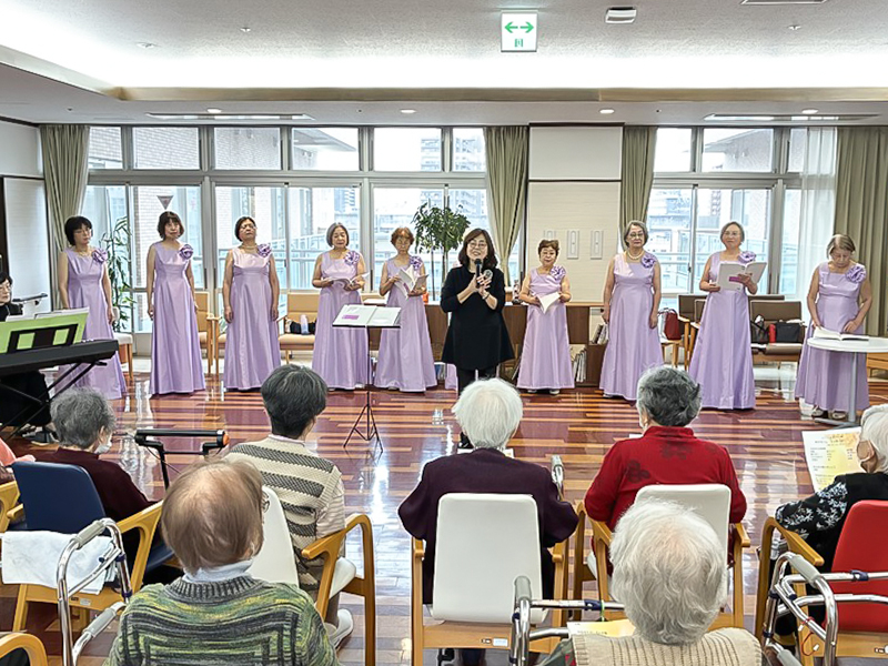 やなせたかしさん作曲の「すてきなおじいさん」「海と涙と私と」など計15曲のコーラスを披露いただき、ご利用者の皆様と一緒に「故郷」「手のひらを太陽に」も唄われました。