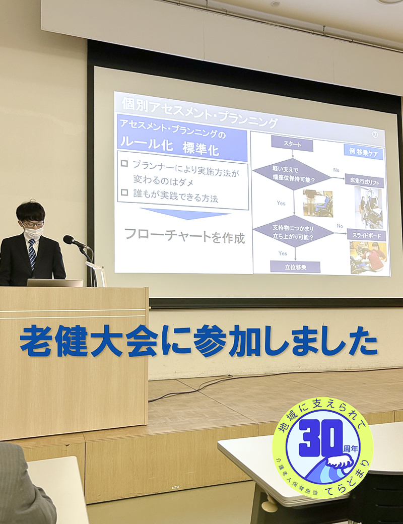 ご利用者だけではなく、職員にとっても安全で快適なケアを行うためにはどうするか、負担の少ない介助方法は何かを検討し、取り組んだ結果を発表させてもらいました。