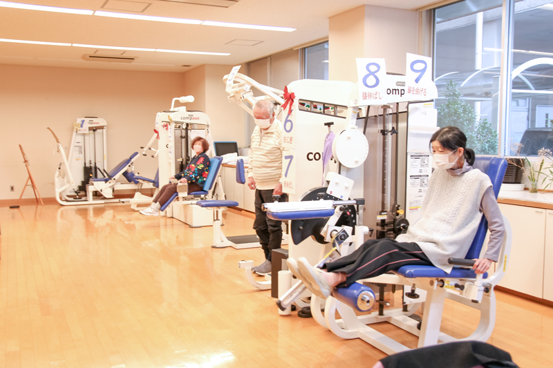 ①バイタルチェック②準備体操③マシントレーニング(途中、水分補給あり)④整理体操⑤バイタルチェックの順番で1日のプログラムが進行します(その他、体力測定などもあります)。