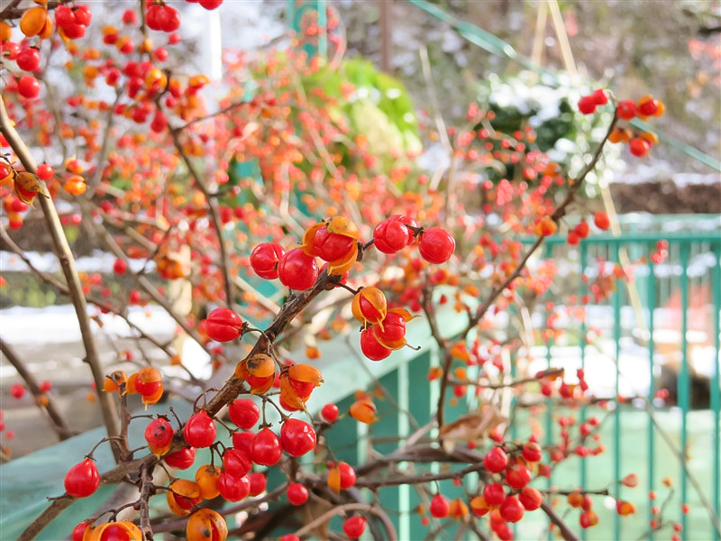 園庭の南天やツルウメモドキは、青白い景色の中の紅一点。目を引きます。