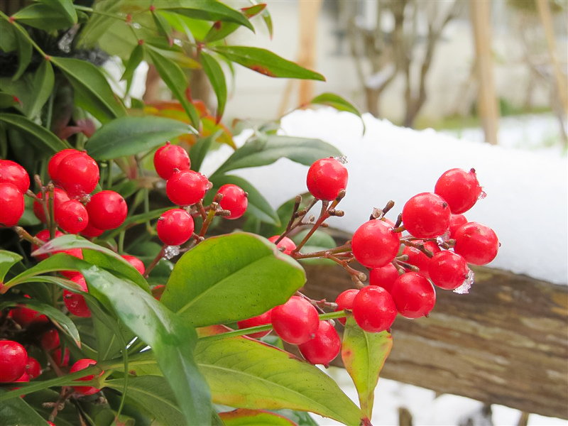 園庭の南天やツルウメモドキは、青白い景色の中の紅一点。目を引きます。