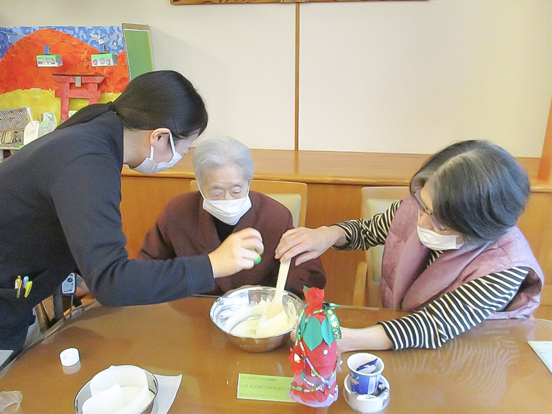 施設からのお知らせ 長岡三古老人福祉会施設からのお知らせクリスマス大忘年会 クリスマス大忘年会 2025年12月25日 桐原の郷 ケアハウス、高齢者生活福祉センターでは、今年のクリスマスに大忘年会を開催しました。 忘年会当日は、クリスマスという事もあり、昼食は特別メニューでした。 美味しい物を食べながら今年1年を振り返り、ご利用者は、楽しいひと時を過ごされました。 そして、「クリスマス」と言えば「ケーキ」は欠かせません! ご利用者と職員が、一緒にチーズケーキをつくりました。 ブルーベリーは、施設の庭で皆さんが大事に育てたものです。