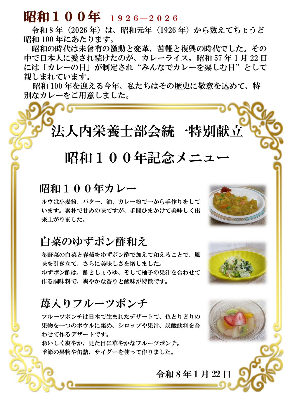 今年度の「統一特別献立」は、昭和100年をむかえ、日本国民に愛されたカレーライスをお届けします。