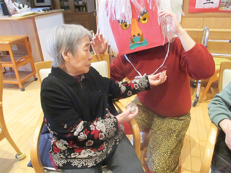 グループホーム中之島では、赤鬼に向かって豆を投げつけるのでなく、赤鬼さんも食べなさいと差し出され、ご利用者さんの優しさに触れる一場面がありました。