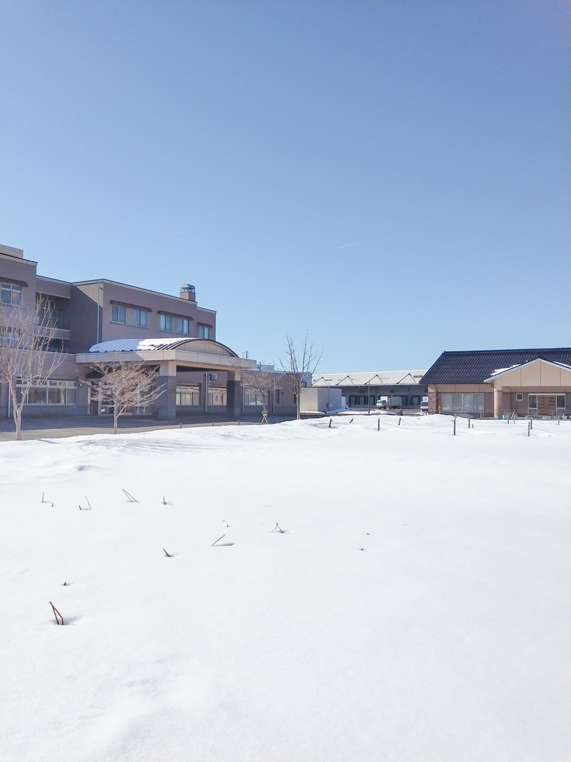 施設前には蓮田が広がります。現在は一面雪に覆われていますが、夏になるとつぼみが花を咲かせ、二千年蓮を楽しむことができます。とても綺麗なので、近くに来られた際はぜひご覧ください😊