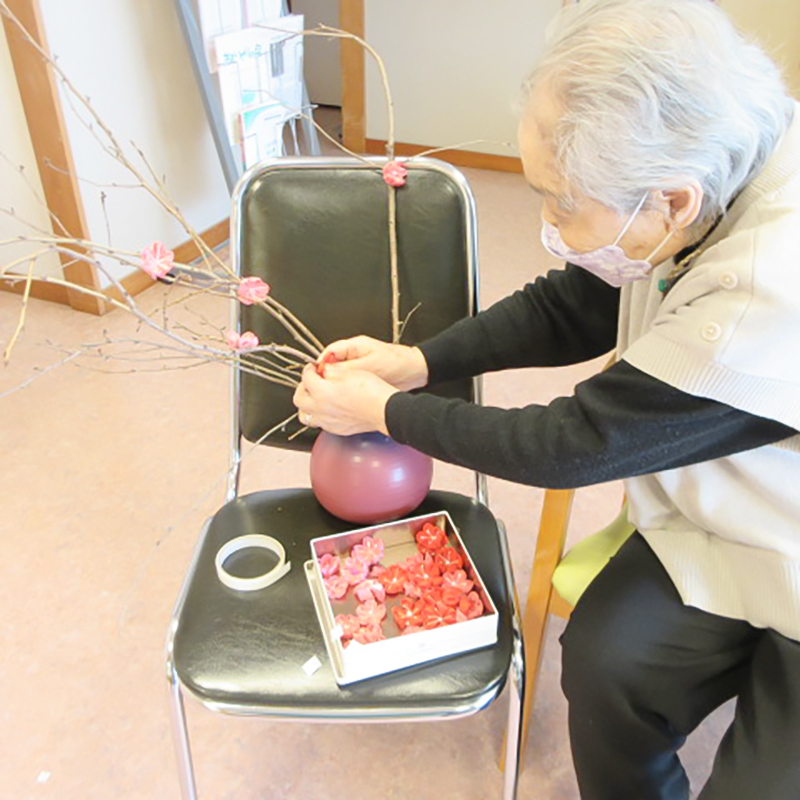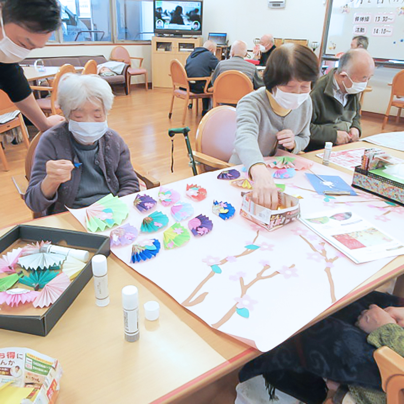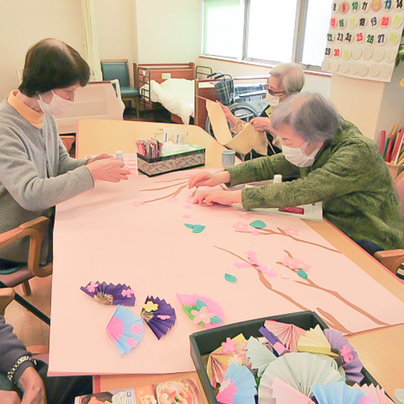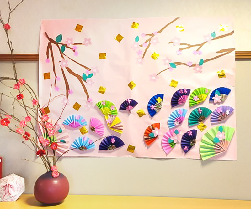 桜の木と和柄の扇子で落ち着いた雰囲気に。