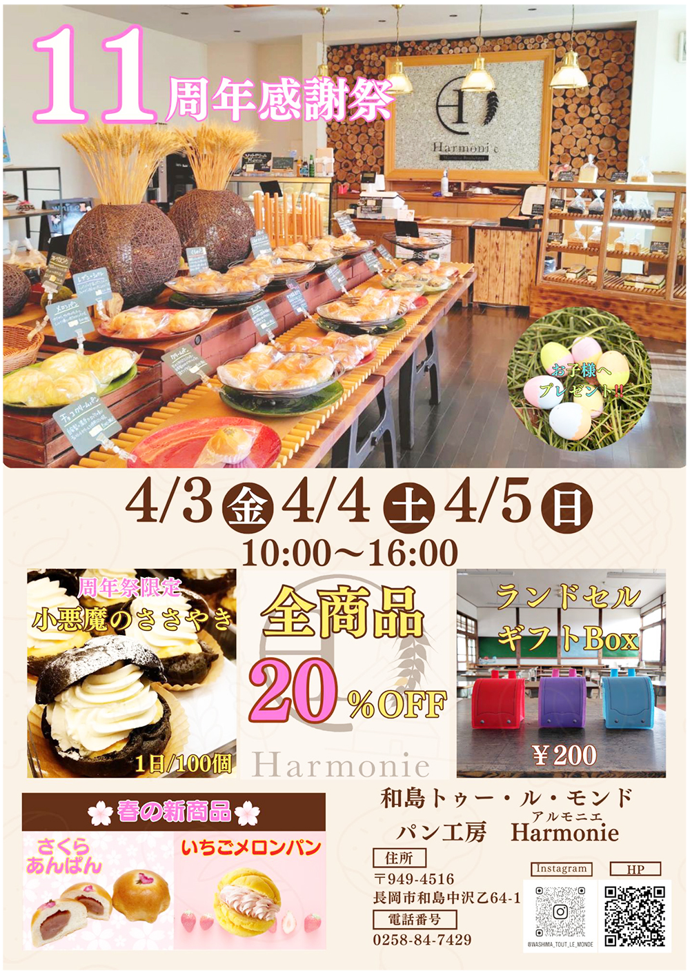 施設からのお知らせ 長岡三古老人福祉会施設からのお知らせアルモニエ11周年感謝祭🎉 アルモニエ11周年感謝祭🎉 2026年04月03日 和島トゥー・ル・モンド 和島トゥー・ル・モンドのパン工房「アルモニエ」では、4/3(金)・4(土)5(日)の3日間、11周年感謝祭を開催しています。 限定のスイーツ、春の新作パンなどをご用意しております。 イベント開催の3日間は、全商品20%OFFで販売♪ 1日100個限定・周年祭スイーツ「小悪魔のささやき」 春の新作「さくらあんぱん(写真左)」「いちごメロンパン(写真右)」 定番商品の調理パンやスイーツパン、オリジナルラスクや桜クッキーもございます。 お近くにお越しの際は、ぜひお立ち寄りください。